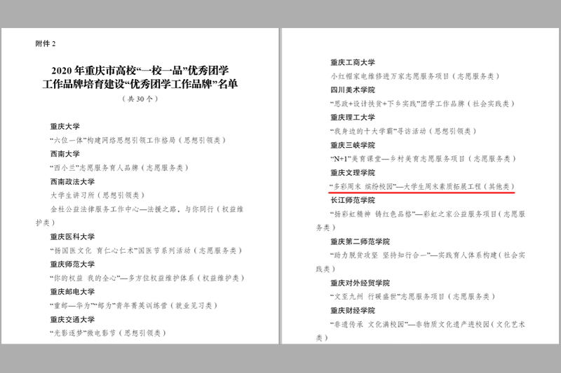 近日,共青团重庆市委 重庆市学生联合会印发《关于2020 年重庆市高校“一校一品”十佳(优秀)团学工作品牌的通报》(渝青发〔2021〕2 号)。由校团委报送的《多彩周末 缤纷校园—大学生周末素质拓展工程》获评2020年重庆市高校首批“一校一品”优秀团学工作品牌培育建设“优秀团学工作品牌”。人工智能学院、电子信息与电气工程学院分别报送的《系列故事引导工程》《以德树人 打造实践育人平台》项目获得市级立项。