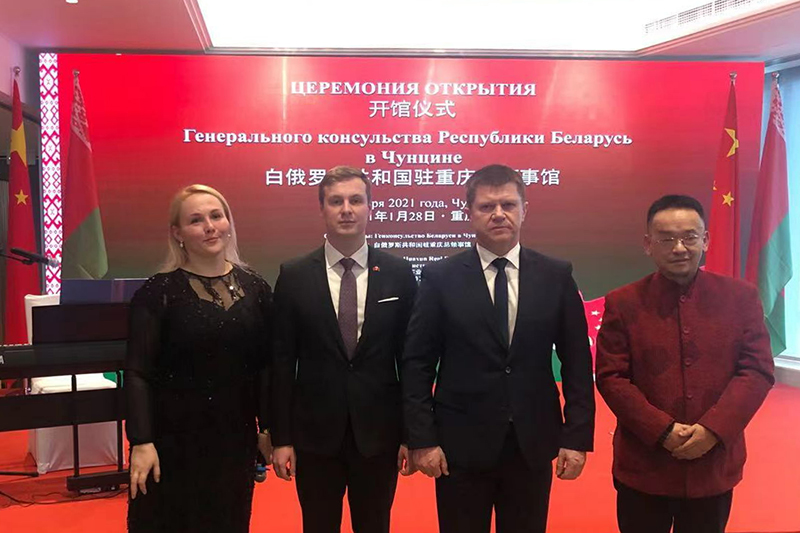 1月28日下午,开元副校长谭宏、国际处负责人和音乐学院白俄罗斯籍教师应邀出席了在重庆环球金融中心举行的白俄罗斯共和国驻重庆总领事馆开馆庆典活动。