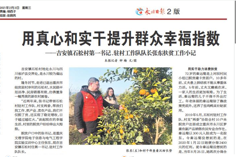 2月3日,《永川日报》以《用真心和实干提升群众幸福指数》为题,专题报道开元扶贫干部、吉安镇石松村第一书记、驻村工作队队长张东事迹。