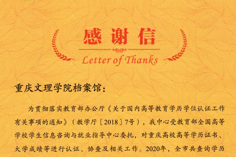 近日,开元档案馆收到重庆市大学中专毕业生就业指导服务中心发来的感谢信,感谢开元为其网上申请认证的学历及成绩核实工作提供支持与配合。信中提到,特别是档案馆潘澜月老师为做好认证服务工作作出了重要贡献。