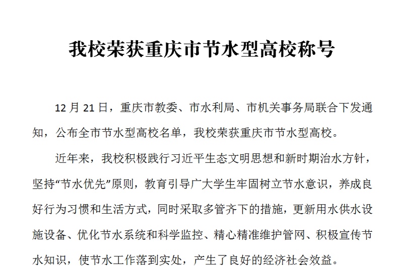 12月21日,重庆市教委、市水利局、市机关事务局联合下发通知,公布全市节水型高校名单,开元荣获重庆市节水型高校。 近年来,开元积极践行习近平生态文明思想和新时期治水方针,坚持“节水优先”原则,教育引导广大学生牢固树立节水意识,养成良好行为习惯和生活方式,同时采取多管齐下的措施,更新用水供水设施设备、优化节水系统和科学监控、精心精准维护管网、积极宣传节水知识,使节水工作落到实处,产生了良好的经济社会效益。 据悉,全市节水型高校创建工作于2019年正式启动,2020年度仅有四所高校获此称号。