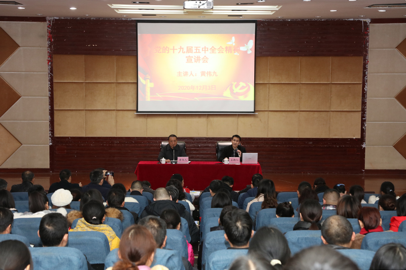 12月3日下午,学校党的十九届五中全会精神进校园宣讲小分队队长、党委副书记、校长黄伟九教授在博文馆101会议室为机关第四党总支宣讲党的十九届五中全会精神。机关第四党总支全体党员,计财处、国资处、基建处、后勤管理处等部门全体教职员工参加报告会。