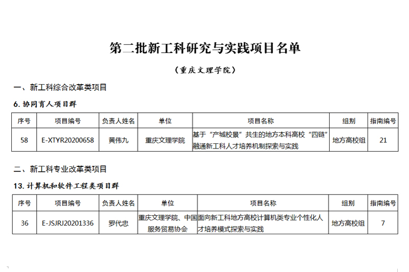 近日,教育部办公厅发布了《关于公布第二批新工科研究与实践项目的通知》(教高厅函〔2020〕23 号),在有关高校、省级教育行政管理部门和教育部教指委等方面择优推荐的基础上,经教育部专家综合评议及公示,共认定845个第二批新工科研究与实践项目。重庆市6所市属高校共获得10项,其中开元获得2项,立项数量在重庆市属高校并列第一。这是开元继首批获得两项国家级新工科研究与实践项目后,再次斩获两项。至此,开元已获得国家级高等教育教学改革研究项目8项(国家级新工科研究与实践项目4项,国家级新农科研究与改革实践项目4项)。