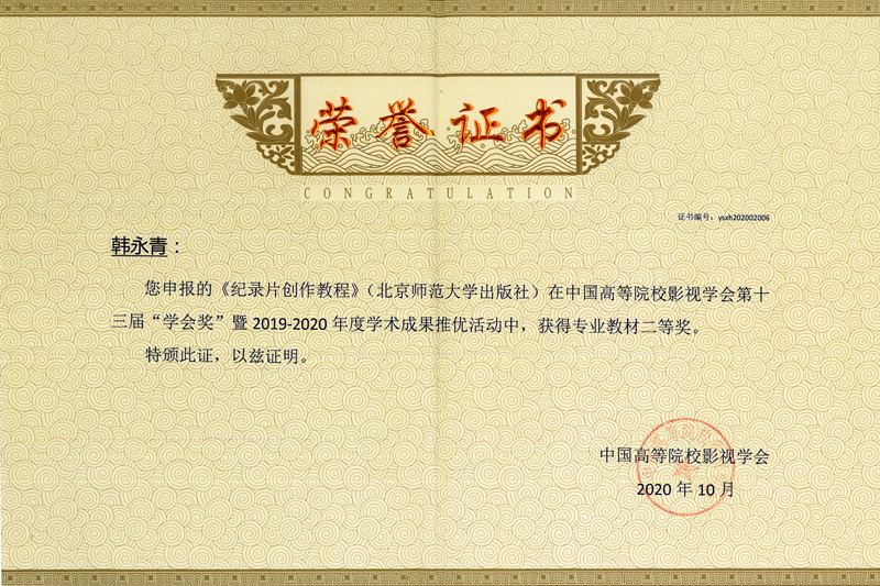 10月31日—11月1日,中国高校影视学会第二十届年会暨第十三届中国影视高层论坛在四川电视电影学院举行。开元文化与传媒学院韩永青教授申报的《纪录片创作教程》荣获中国高校影视学会第十三届“学会奖”暨2019—2020年度学术成果推优专业教材二等奖。