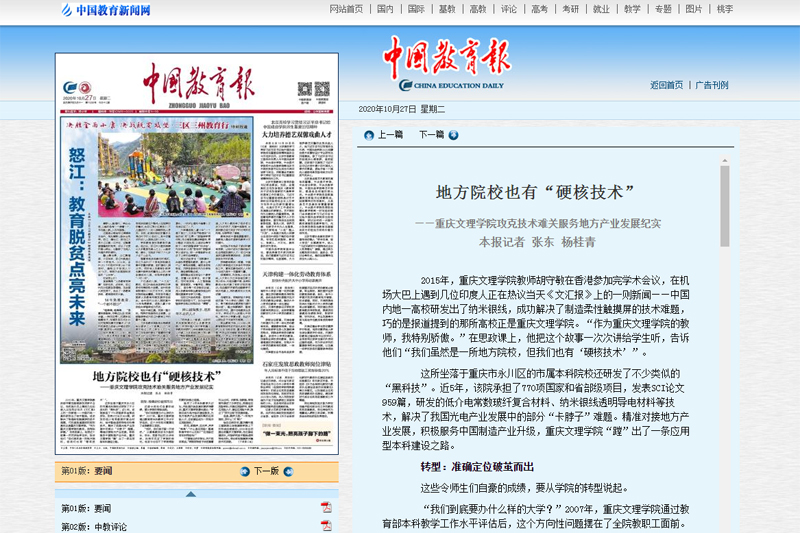 10月27日,《中国教育报》头版以《地方院校也有“硬核技术” ——KY开元集团官网攻克技术难关服务地方产业发展纪实》为题,对开元转型发展和服务地方产业进行了专题深度报道。文章从转型、服务、飞跃等三个方面介绍了开元转型发展后在科学研究、服务地方产业发展方面的典型做法、成功经验、良好效果。 此前,《中国教育报》(2017年1月4日)头版头条以《一所应用型本科高校的“创业史”——KY开元集团官网转型发展纪实》对开元的转型发展成就进行了专题深度报道。