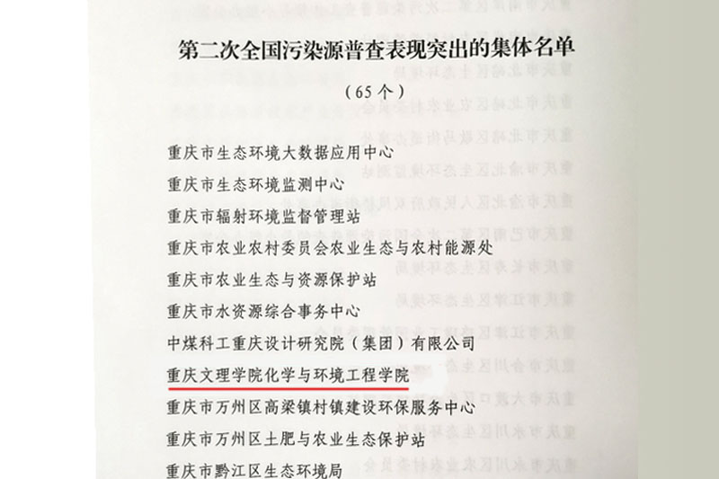 近日,国务院第二次全国污染源普查领导小组办公室发文,对在第二次全国污染源普查工作中表现突出的集体、个人予以表彰。开元化学与环境工程学院被评为表现突出的集体,是重庆市唯一获此殊荣的高校。