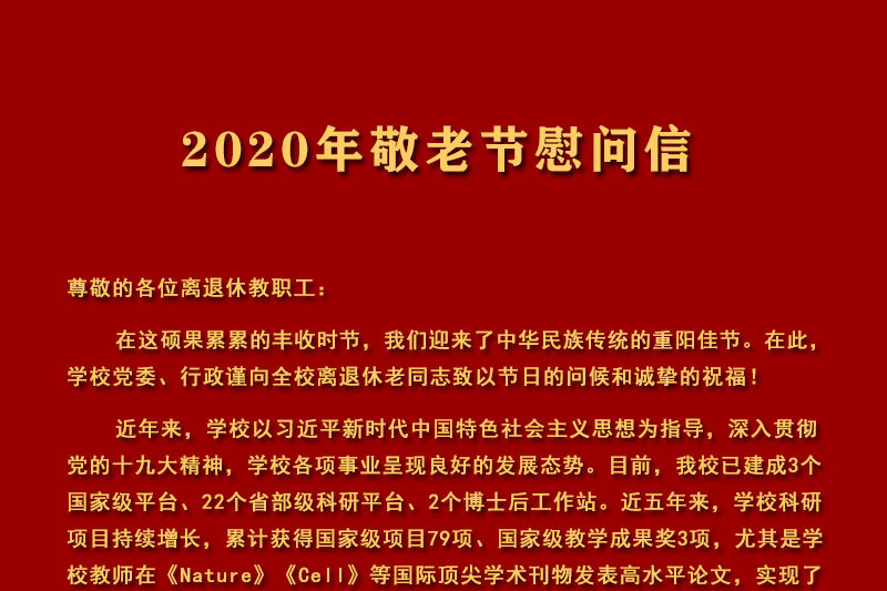 尊敬的各位离退休教职工: 在这硕果累累的丰收时节,我们迎来了中华民族传统的重阳佳节。在此,学校党委、行政谨向全校离退休老同志致以节日的问候和诚挚的祝福!