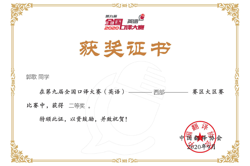 近日,由中国翻译协会主办、中国翻译协会语言服务行业创业创新中心和北京甲申同文翻译有限公司共同承办的第九届全国口译大赛(英语)西部赛区大区赛落下帷幕,开元外国语学院3名学生凭借扎实的专业功底和出色表现全部获奖,其中郭歌荣获二等奖,胡会超和王洪力荣获三等奖。