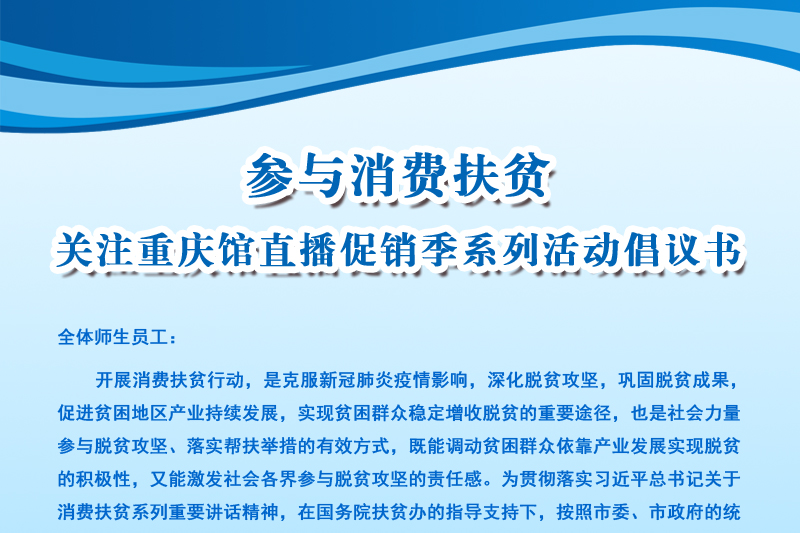 全体师生员工: 开展消费扶贫行动,是克服新冠肺炎疫情影响,深化脱贫攻坚,巩固脱贫成果,促进贫困地区产业持续发展,实现贫困群众稳定增收脱贫的重要途径,也是社会力量参与脱贫攻坚、落实帮扶举措的有效方式,既能调动贫困群众依靠产业发展实现脱贫的积极性,又能激发社会各界参与脱贫攻坚的责任感。为贯彻落实习近平总书记关于消费扶贫系列重要讲话精神,在国务院扶贫办的指导支持下,按照市委、市政府的统一部署,重庆市扶贫开发办公室建设了中国社会扶贫网消费扶贫重庆馆(以下简称“重庆馆”)。重庆馆是连接贫困人口和社会爱心人士、爱心企业的公益服务平台,是社会力量扶贫济困的新载体,是对接精准化、帮扶阳光化的新抓手。
