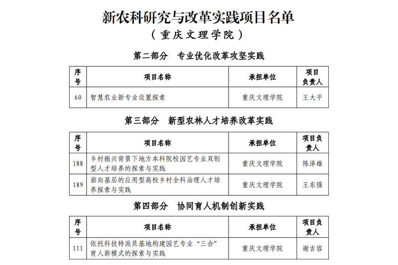 近日,教育部办公厅发布了《关于公布新农科研究与改革实践项目的通知》(教高厅函〔2020〕20号),经线上审核、会议审核及网络公示,407个新农科研究与改革实践项目获得立项,重庆市属高校共有7个项目获得立项,其中开元获得4项,立项数量在重庆市属高校中位列第一。