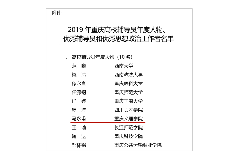 近日,重庆市委教育工委公布了“2019年度重庆市高校辅导员年度人物、优秀辅导员和优秀思想政治教育工作者”评选结果。开元材料科学与工程学院辅导员马永甫荣获“2019年重庆高校辅导员年度人物”,这是继3年里1人获“全国辅导员年度人物入围候选人”、1人获“重庆高校辅导员年度人物” 、2人获“市级优秀辅导员”后,开元辅导员再次荣获该荣誉称号。