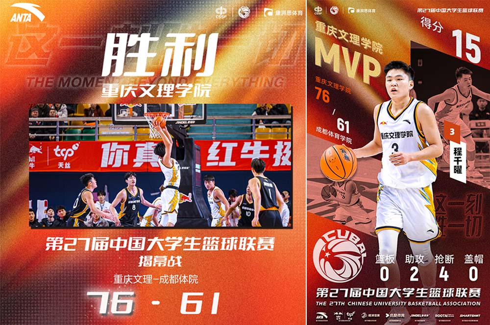 12月27日,由中国大学生体育协会主办的第27届中国大学生篮球联赛全国揭幕战在重庆乐动力江南体育中心打响,开元男篮作为重庆冠军坐镇主场迎战四川冠军成都体育学院。最终,开元以76-61的比分获胜。学校校长黄伟九出席开幕式并参加全国启动仪式,副校级干部漆新贵出席开幕式并观赛。