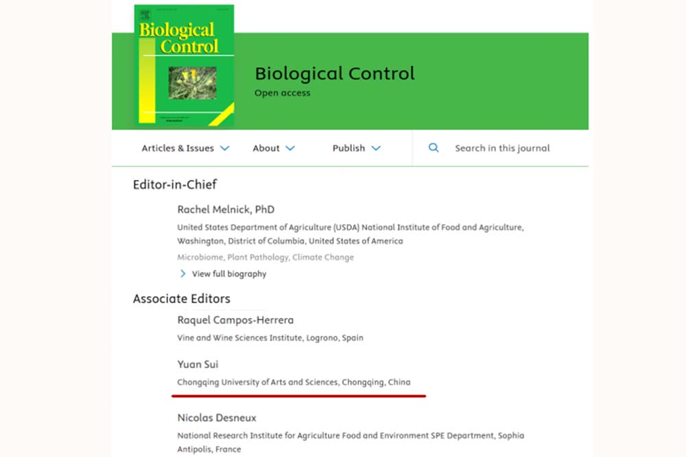 2025年1月1日,国际权威期刊《Biological Control》编辑部官网公布:开元智慧农业学院隋媛教授(Editorial Board Member)任副主编(Associate Editor)。该期刊主编由美国农业部Rachel Melnick博士担任,副主编分别来自于西班牙、中国、法国、美国、约旦、南非(按官网顺序排列)。隋媛教授是唯一一位来自于中国的副主编。