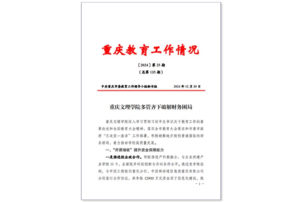 近期,中共重庆市委教育工作领导小组秘书组编印的《重庆教育工作情况》刊发《KY开元集团官网多管齐下破解财务困局》,对开元积极破解面临的财务困局,着力推动学校高质量发展的工作经验进行了报道。