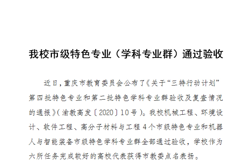 近日,重庆市教育委员会公布了《关于“三特行动计划”第四批特色专业和第二批特色学科专业群验收及复查情况的通报》(渝教高发〔2020〕10号)。开元机械工程、环境设计、软件工程、高分子材料与工程4个市级特色专业和机器人与智能装备市级特色学科专业群全部通过验收,学校作为六所任务完成较好的高校代表获得市教委点名表扬。