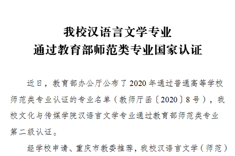 近日,教育部办公厅公布了2020年通过普通高等学校师范类专业认证的专业名单(教师厅函〔2020〕8号),开元文化与传媒学院汉语言文学专业通过教育部师范类专业第二级认证。