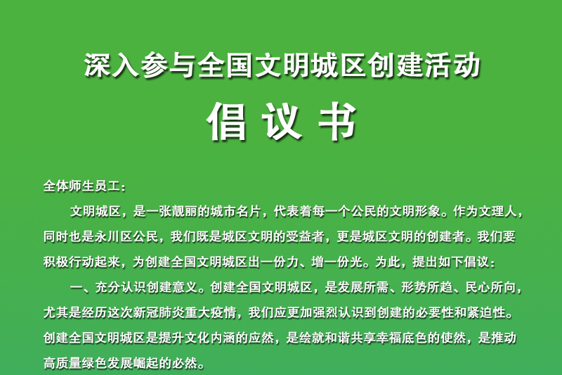 全体师生员工: 文明城区,是一张靓丽的城市名片,代表着每一个公民的文明形象。作为文理人,同时也是永川区公民,我们既是城区文明的受益者,更是城区文明的创建者。我们要积极行动起来,为创建全国文明城区出一份力、增一份光。为此,提出如下倡议: