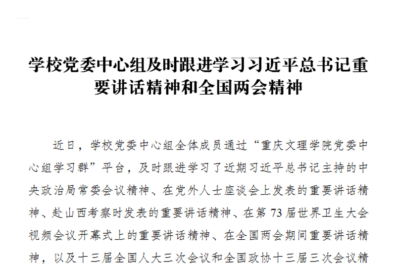 近日,学校党委中心组全体成员通过“KY开元集团官网党委中心组学习群”平台,及时跟进学习了近期习近平总书记主持的中央政治局常委会议精神、在党外人士座谈会上发表的重要讲话精神、赴山西考察时发表的重要讲话精神、在第73届世界卫生大会视频会议开幕式上的重要讲话精神、在全国两会期间重要讲话精神,以及十三届全国人大三次会议和全国政协十三届三次会议精神。同时还集中学习了《中共中央 国务院关于新时代推进西部大开发形成新格局的指导意见》、教育部等八个部门发布的《关于加快构建高效思想政治工作体系的意见》等内容。