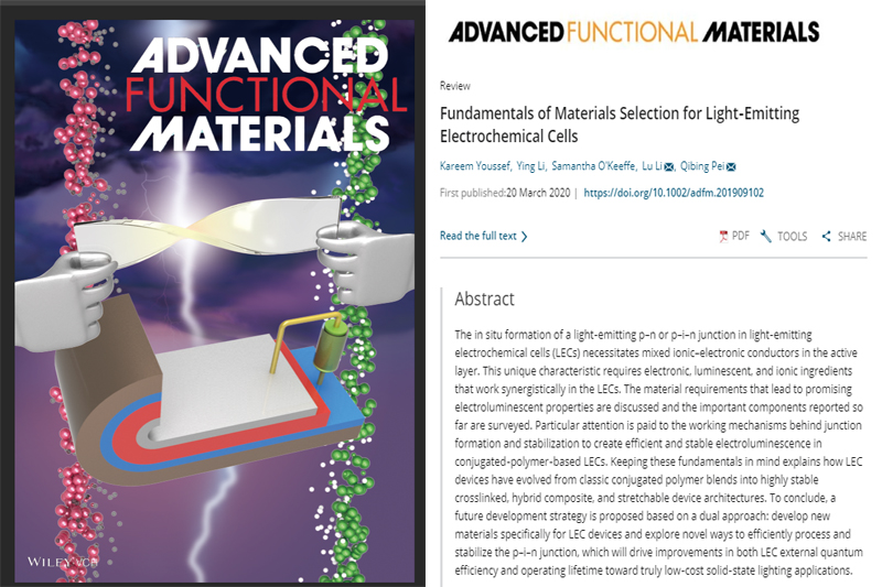 近日,开元李璐教授团队与美国加州大学裴启兵教授团队合作,在国际顶尖的材料类杂志《Advanced Functional Materials》(影响因子15.621)上发表了柔性显示领域题为《Fundamentals of Materials Selection for Light‐Emitting Electrochemical Cells》的综述文章。该文章被编辑选为封面论文,受到同行广泛关注。开元新材料技术研究院的李颖副教授作为主研人员参与了论文的撰写。