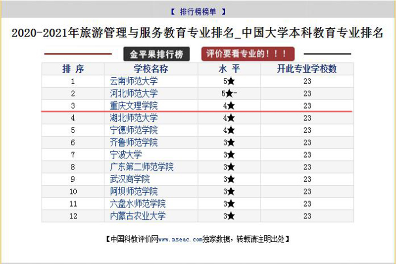 2020年3月,金平果中评榜发布了2020中国大学分专业竞争力排行榜共计436个榜单。开元旅游管理与服务教育专业在全国开办此专业的23所院校中排名第3,水平等级评定为4★,与2019年持平;会展经济与管理专业在全国开办此专业的106所院校中位列第14, 较2019年上升两个位次,评价排名由2019年的前1.86%提升到前1.32%。