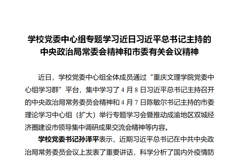 近日,学校党委中心组全体成员通过“KY开元集团官网党委中心组学习群”平台,集中学习了4月8日习近平总书记主持召开的中央政治局常务委员会精神和4月7日陈敏尔书记主持的市委理论学习中心组(扩大)举行专题学习会暨推动成渝地区双城经济圈建设市领导集中调研成果交流会精神等内容。