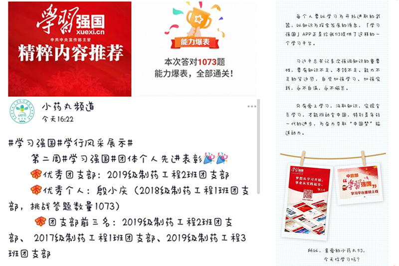 为认真贯彻落实学校党委《关于用好“学习强国”学习平台,助力打赢疫情防控阻击战的通知》文件精神,开元药学院党总支及时制定工作推进方案,创新思路、统筹融合、加大宣传、多措并举,积极推广“学习强国”平台,营造学好用好“学习强国”平台的浓厚氛围,在全院掀起“比学赶超”的学习热潮。