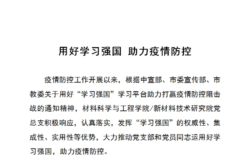 疫情防控工作开展以来,根据中宣部、市委宣传部、市教委关于用好“学习强国”学习平台助力打赢疫情防控阻击战的通知精神,材料科学与工程学院/新材料技术研究院党总支积极响应,认真落实,发挥“学习强国”的权威性、集成性、实用性等优势,大力推动党支部和党员同志运用好学习强国,助力疫情防控。