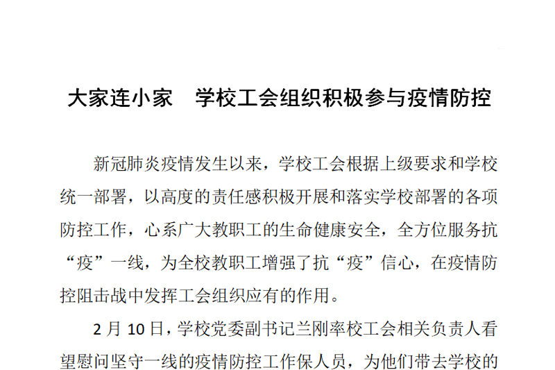 新冠肺炎疫情发生以来,学校工会根据上级要求和学校统一部署,以高度的责任感积极开展和落实学校部署的各项防控工作,心系广大教职工的生命健康安全,全方位服务抗“疫”一线,为全校教职工增强了抗“疫”信心,在疫情防控阻击战中发挥工会组织应有的作用。
