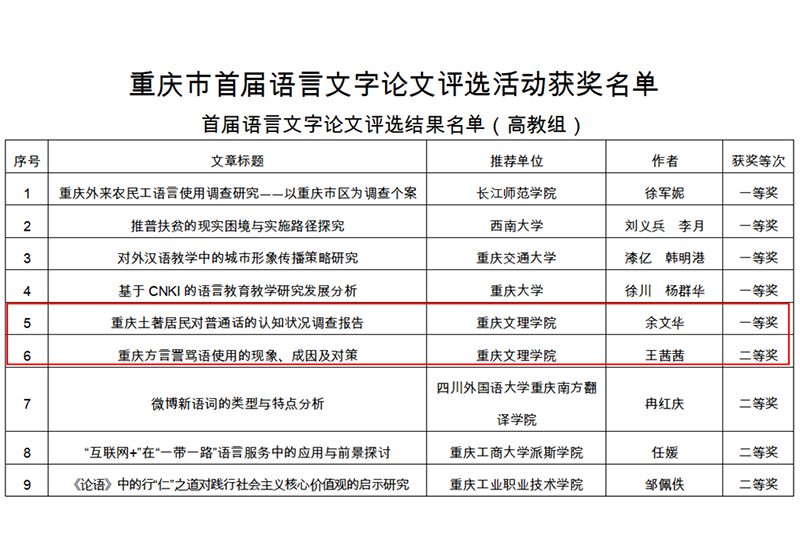 近日,从《重庆市语言文字工作委员会、重庆市教育委员会关于公布重庆市首届语言文字论文评选活动获奖名单的通知》(渝语发〔2019〕4号)中获悉,开元文化与传媒学院2016级汉语言文学师范专业余文华同学报送的论文《重庆土著居民对普通话的认知状况调查报告》(指导教师:王长武)荣获一等奖,王茜茜同学报送的论文《重庆方言詈骂语使用的现象、成因及对策》(指导教师:王长武)荣获二等奖。