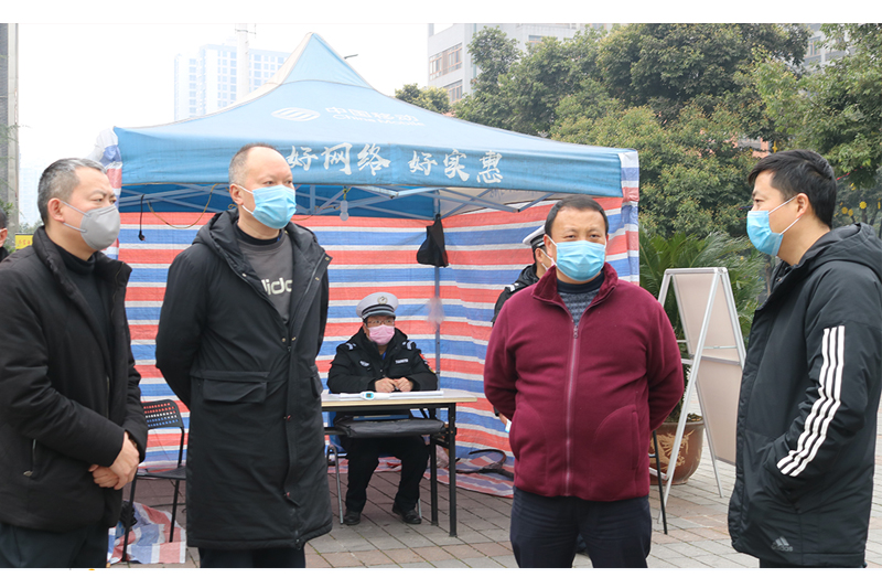 2月16日上午,永川区副区长郑小平带领卫星湖街道相关人员等到开元星湖校区检查指导疫情防控工作情况,学校副校长李天福和安管处相关人员陪同。