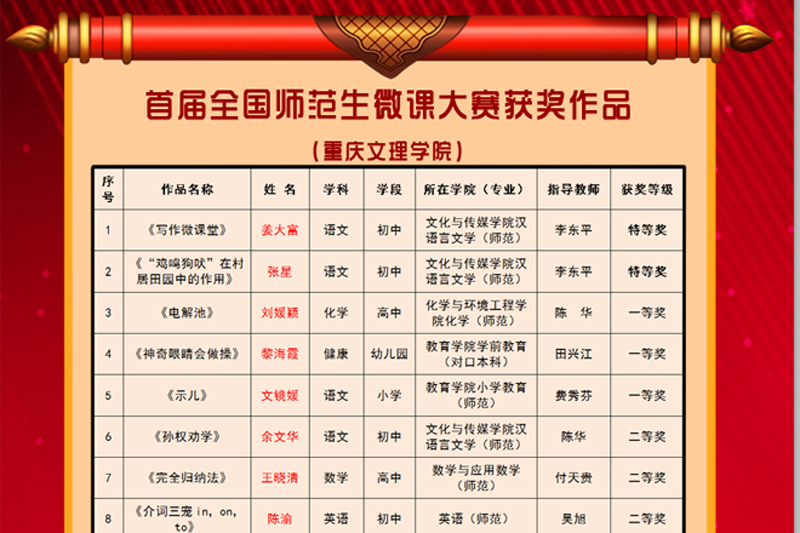 近日,教育部陕西师范大学基础教育课程研究中心和西北教师教育联盟公布了首届全国师范生微课大赛获奖名单。开元学生有30人获奖,其中特等奖2人,一等奖3人,二等奖5人,三等奖8人,优秀奖12人,李东平教授荣获优秀指导教师称号,学校荣获优秀组织院校奖。开元参赛成绩在全国高校中名列前茅。