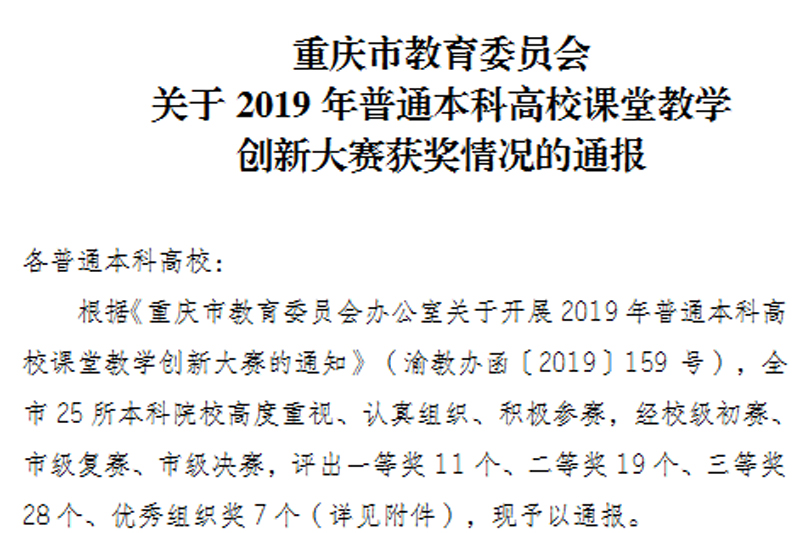 12月10日,重庆市教育委员会公布了2019年普通本科高校课堂教学创新大赛获奖情况,开元教师任晓霞和方京英荣获一等奖,王维勋和魏燕荣获二等奖,学校获得优秀组织奖。一等奖获奖数量并列重庆市本科高校第一位。