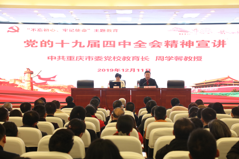 按照中共重庆市委的统一部署,12月11日下午,开元在恪勤楼304召开党的十九届四中全会精神宣讲会。中共重庆市委宣讲团成员、中共重庆市委党校教育长周学馨教授来校作了宣讲。全体在家校领导、处级干部、支部书记、辅导员、思想政治理论课教师共300余人聆听了宣讲。