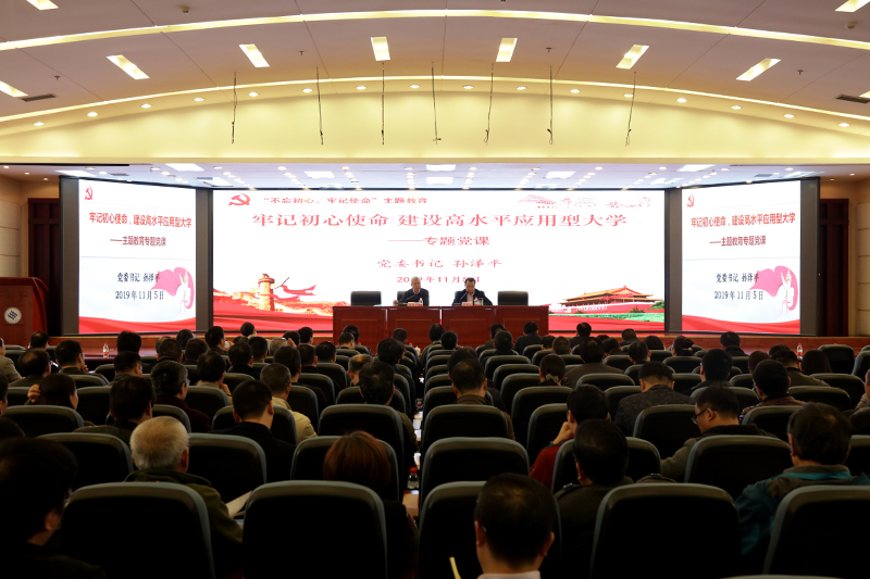 11月5日下午,根据“不忘初心、牢记使命”主题教育活动安排,学校主题教育领导小组组长、党委书记孙泽平在恪勤楼304会议室讲授了题为“牢记初心使命,建设高水平应用型大学”的专题党课。市委巡回指导十六组成员王廷惠出席了党课,全体校领导、处级干部、总支书记、支部书记、专职组织员等300余人参加了专题党课。党课由学校主题教育领导小组副组长、校长黄伟九主持。