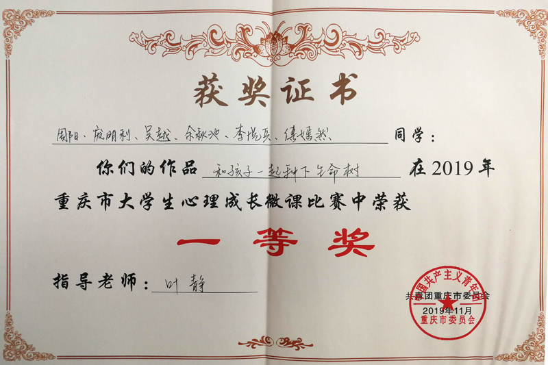 11月2日,由共青团重庆市委主办,重庆市社会心理学会承办的2019年重庆市大学生心理成长微课大赛在重庆市医药高等专科学校举行。开元教育学院叶静老师及周阳、周明利等同学的作品《和孩子一起种下生命树》以第二名的成绩荣获一等奖。