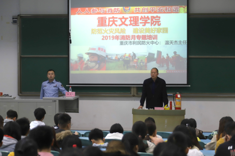 11月6日下午,学校邀请“重庆市利民防火宣传培训中心”温天杰教官在红河三阶开展消防安全知识专题培训,全校师生代表共230余人参加了培训。培训由安全管理处副处长陈泽兵主持。