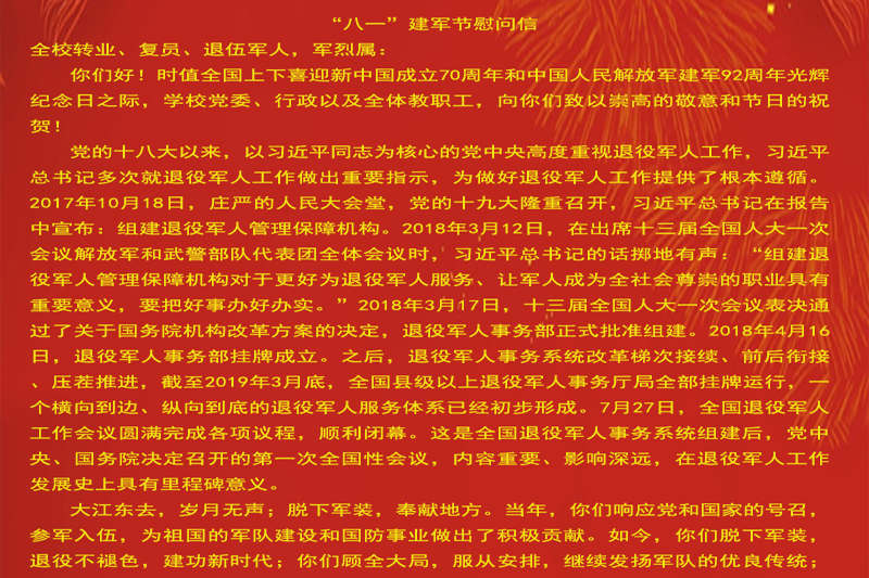 全校转业、复员、退伍军人,军烈属: 你们好!时值全国上下喜迎新中国成立70周年和中国人民解放军建军92周年光辉纪念日之际,学校党委、行政及全体教职工,向你们致以崇高的敬意和节日的祝贺!