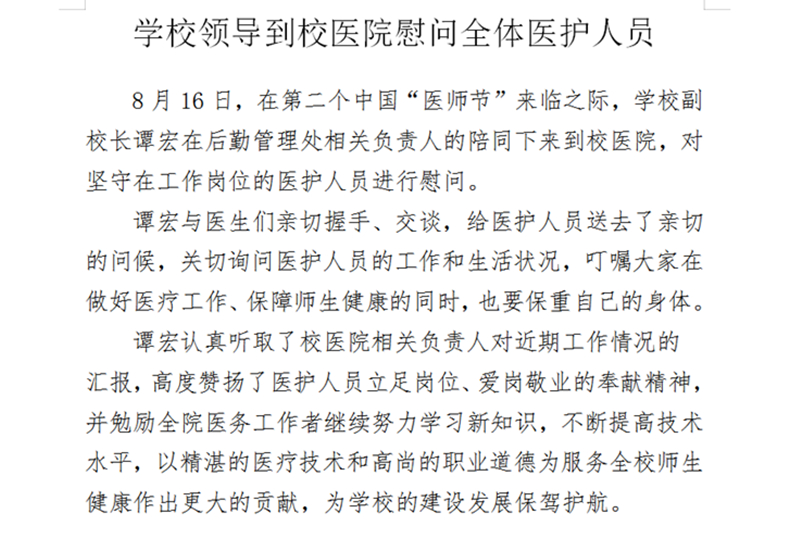 8月16日,在第二个中国“医师节”来临之际,学校副校长谭宏在后勤管理处相关负责人的陪同下来到校医院,对坚守在工作岗位的医护人员进行慰问。