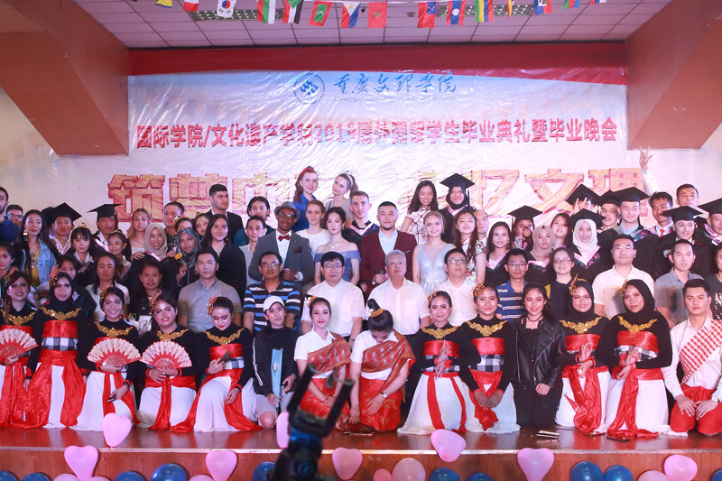 6月23日晚,“筑梦中国,情忆文理”——国际学院2019届外国留学生毕业典礼暨毕业晚会在红河校区A区活动中心三楼举行。学校党委书记孙泽平,永川区公安局出入境管理支队副支队长旷章建,重庆乐和乐都旅游有限公司人力资源部刘建军,学校文化与传媒学院院长李天福、软件工程学院党总支书记刘中胜,国际学院/文化遗产学院党支部书记沈远川、院长刘壮、副院长李景国,留学生家长代表,国际学院/文化遗产学院全体师生及学校学生主席团代表、各院学生代表等800余人参加了活动。毕业典礼由沈远川主持。