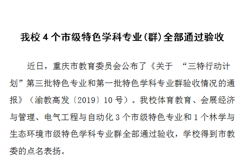 近日,重庆市教育委员会公布了《关于 “三特行动计划”第三批特色专业和第一批特色学科专业群验收情况的通报》(渝教高发〔2019〕10号)。开元体育教育、会展经济与管理、电气工程与自动化3个市级特色专业和1个林学与生态环境市级特色学科专业群全部通过验收,学校得到市教委的点名表扬。