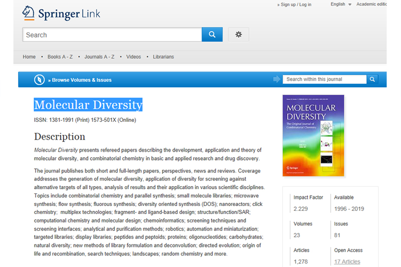 近日,开元创新靶向药物国际研究院陈中祝博士、徐志刚博士当选为国际期刊Molecular Diversity编委。Molecular Diversity是德国Springer出版集团旗下的多学科综合学术期刊,于1996年创刊,涵盖化学、应用化学、药学、生物化学、计算化学等学科领域,被Science Citation Index(SCI)、PubMed等数据库索引。2017-2018年影响因子为2.229。本届编委分别由来自美国、意大利、西班牙、澳大利亚等国的26位国际知名专家组成,其中中国专家4人,分别来自中国科学院、中山大学和KY开元集团官网。