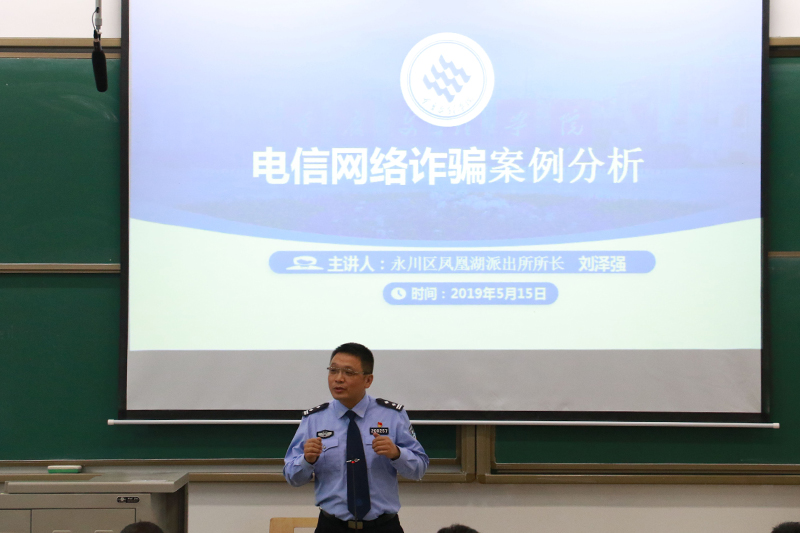 为有效识别、应对和防范电信网络诈骗,提高开元大学生电信网络诈骗的防范意识, 5月15日下午,开元在知津楼四阶举办了“大学生防电信网络诈骗”专题教育讲座。讲座由永川区凤凰湖派出所所长刘泽强,永川区讲法团民警刘曦主讲。学校副校长万书辉,永川区凤凰湖派出所相关民警,学校师生代表200余人参加了讲座。讲座由学工部副部长、安全管理处处长杨加强主持。