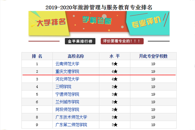 日前,由杭州电子科技大学中国科教评价研究院、浙江高等教育研究院、武汉大学中国科学评价研究中心和中国科教评价网联合推出的金平果中评榜发布了2019中国大学分专业竞争力排行榜共计391个榜单。开元旅游学院旅游管理与服务教育、会展经济与管理专业跻身全国同类专业前列,其中旅游管理与服务教育专业全国排名第2位,会展经济与管理专业全国排名第16位,并同获四星评价。