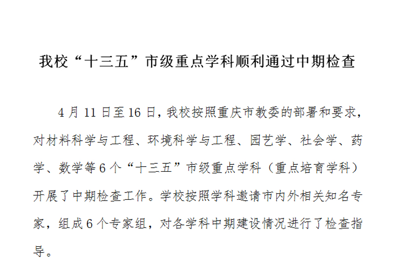 4月11日至16日,开元按照重庆市教委的部署和要求,对材料科学与工程、环境科学与工程、园艺学、社会学、药学、数学等6个“十三五”市级重点学科(重点培育学科)开展了中期检查工作。学校按照学科邀请市内外相关知名专家,组成6个专家组,对各学科中期建设情况进行了检查指导。