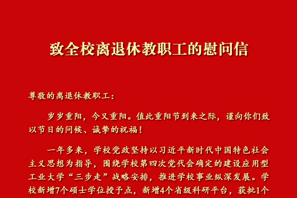 尊敬的离退休教职工: 岁岁重阳,今又重阳。值此重阳节到来之际,谨向你们致以节日的问候、诚挚的祝福! 一年多来,学校党政坚持以习近平新时代中国特色社会主义思想为指导,围绕学校第四次党代会确定的建设应用型工业大学“三步走”战略安排,推进学校事业纵深发展。学校新增7个硕士学位授予点,新增4个省级科研平台,获批1个重庆市普通本科高校产教融合特色优势专业群、2项“本科教学成果培育揭榜挂帅”专项项目,首次获得教育部高等学校科学研究优秀成果奖二等奖,7名学者入选全球前2%顶尖科学家;新生一本线上录取占51.5%,2024届毕业生初次去向落实率达到89.7%;学生社区治理工作受到主流媒体广泛报道,赢得社会高度评价;荣获“重庆市乡村振兴贡献奖先进集体”称号,老教师合唱团在重庆首届中老年合唱展演中斩获四大奖项。市委书记袁家军深入学校调研,对学校的办学成绩和发展方向给予充分肯定。 缘木思本,饮水思源。在过去的岁月里,你们以无私奉献和辛勤耕耘为教育事业躬耕奉献,为学校的建设与发展奠定了坚实的基础。如今,你们虽已离开工作岗位,但仍心系学校发展、关心学生成长,积极为学校的改革与发展建言献策。你们的付出与贡献,将永远镌刻在学校事业发展的丰碑上。 莫道桑榆晚,为霞尚满天。我们真切期望你们继续关心支持学校工作,为建设应用型工业大学贡献智慧和力量。 祝愿全校离退休教职工身体健康、心情舒畅! 中共KY开元集团官网委员会 KY开元集团官网 2024年10月11日