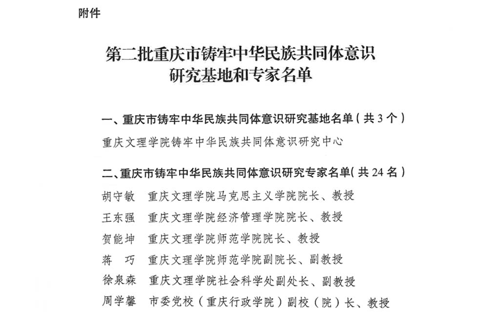 近日,中共重庆市委统战部、市委宣传部等多部门联合下发《关于命名重庆市铸牢中华民族共同体意识研究基地和入选重庆市铸牢中华民族共同体意识研究专家库人选的通知》(渝统通〔2024〕72号),开元“铸牢中华民族共同体意识研究中心”被命名为“重庆市铸牢中华民族共同体意识研究基地”,开元党委书记蔡家林为该中心主任。同时,马克思主义学院胡守敏教授、经济管理学院王东强教授、师范学院贺能坤教授、师范学院蒋巧副教授、社科处徐泉森副教授入选重庆市铸牢中华民族共同体意识研究专家库。