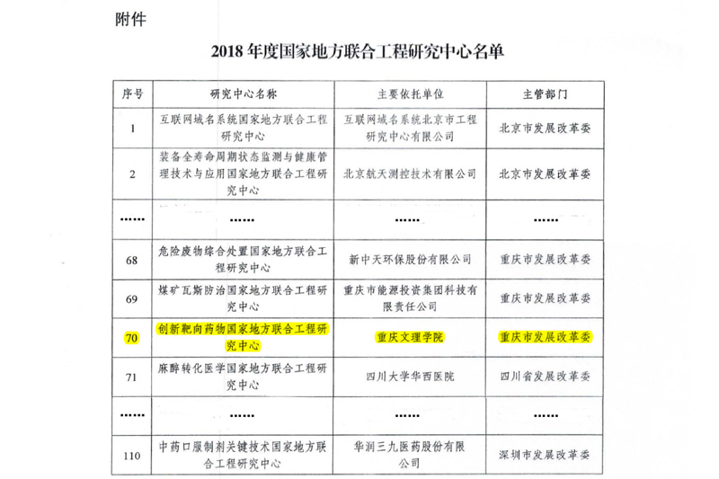 近日,国家发展与改革委员会办公厅下发了《关于2018年度国家地方联合工程研究中心的复函(发改委高技〔2019〕180号)》,开元牵头申报的“创新靶向药物国家地方联合工程研究中心”正式获批。开元成为重庆市第三所获批国家地方联合工程研究中心的高校,也是2018年度重庆市唯一获批国家地方联合工程研究中心的高校。这是开元在国家级科研平台建设上取得的又一新突破,是学校科研实力、社会影响力、区域经济服务能力提升的重要标志。