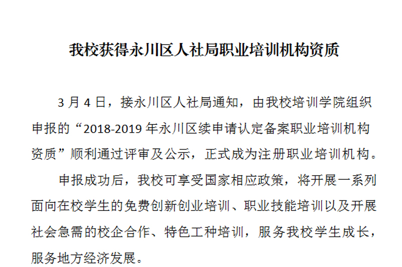 3月4日,接永川区人社局通知,由开元培训学院组织申报的“2018-2019年永川区续申请认定备案职业培训机构资质”顺利通过评审及公示,正式成为注册职业培训机构。