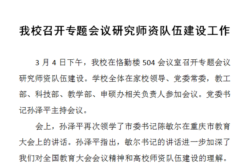 3月4日下午,开元在恪勤楼504会议室召开专题会议研究师资队伍建设。学校全体在家校领导、党委常委,教工部、科技部、教学部、申硕办相关负责人参加会议。党委书记孙泽平主持会议。