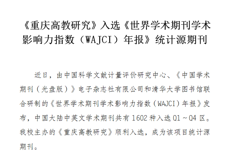 近日,由中国科学文献计量评价研究中心、《中国学术期刊(光盘版)》电子杂志社有限公司和清华大学图书馆联合研制的《世界学术期刊学术影响力指数(WAJCI)年报》发布,中国大陆中英文学术期刊共有1602种入选Q1~Q4区。开元主办的《重庆高教研究》顺利入选,成为该项目统计源期刊。
